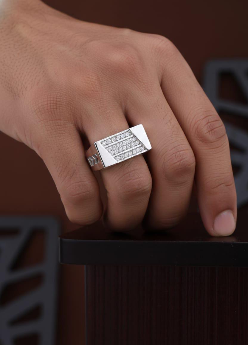 Make a bold statement with this 925 Sterling Silver Geometric Signet Ring for men. Its edgy design features a wide, elevated face with three striking rows of sparkling micro pave cubic zirconia (CZ). Perfect for regular wear, this substantial yet lightweight ring offers a modern, luxurious look and is completely hypoallergenic for comfortable daily use.