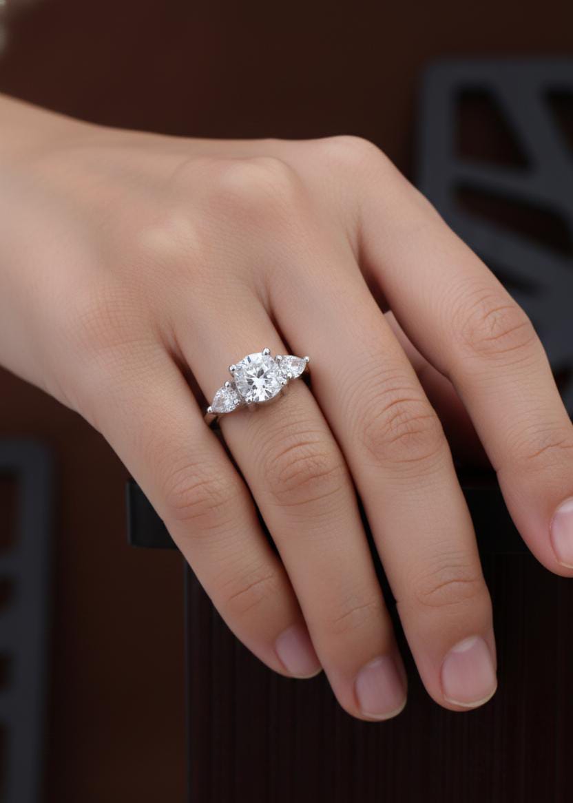 Discover the brilliance of our lightweight 925 Sterling Silver Three-Stone Cluster Ring. This elegant piece features a central round cubic zirconia (CZ) flanked by two sparkling pear-cut CZ stones, creating a dazzling display. Perfect for regular wear, this hypoallergenic ring offers maximum sparkle and comfort as an affordable engagement ring or a beautiful statement piece.