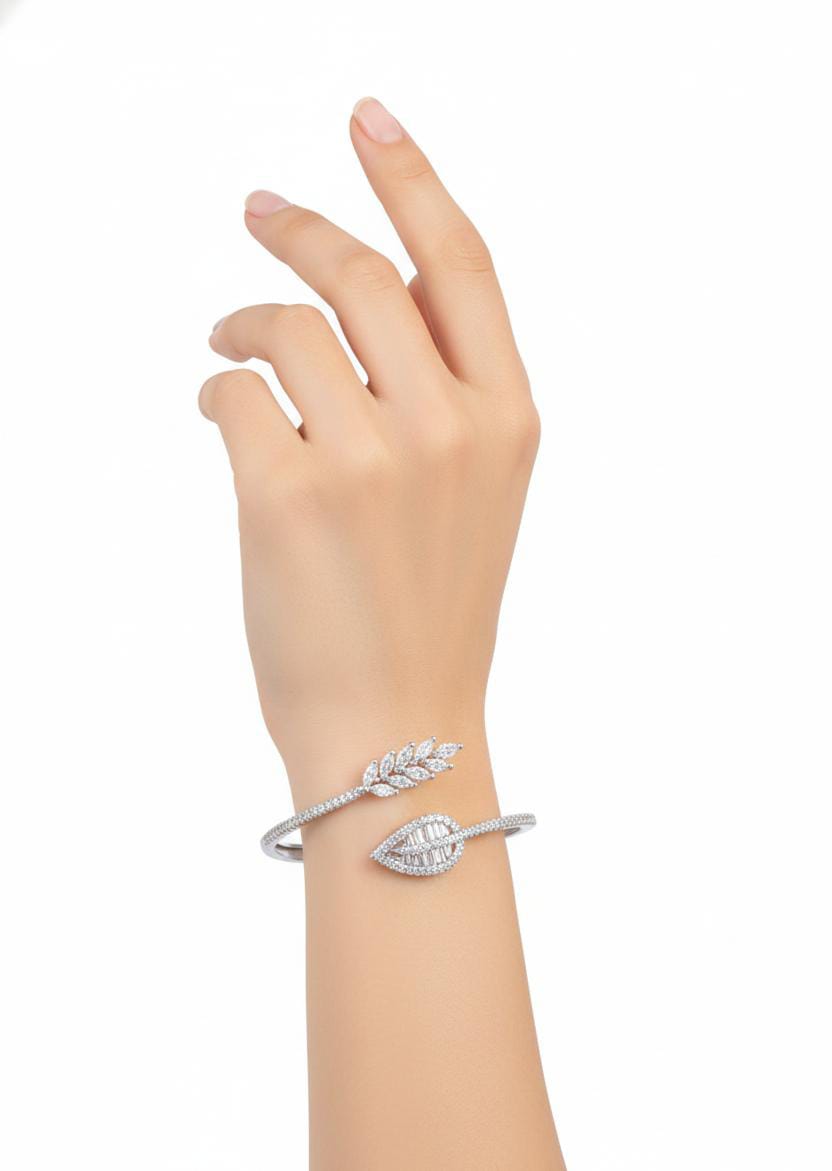 Inspired by the quiet beauty of nature, this open bracelet features a graceful vine motif on one end and a shimmering leaf design on the other. The combination of marquise-cut and baguette-style stones adds a luxurious sparkle without ever feeling heavy, making it ideal for effortless daily wear.