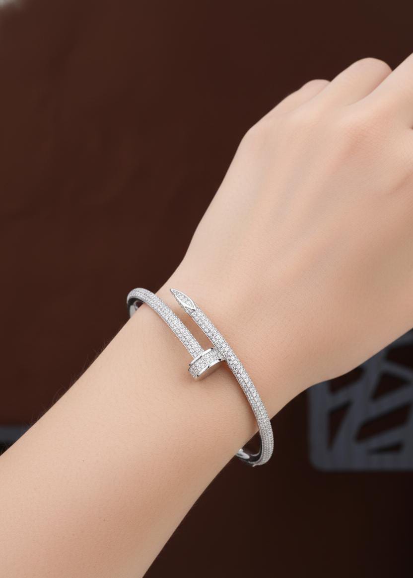 Bold yet beautifully refined, this pavé nail bracelet adds a contemporary edge to your everyday style. Designed with delicate detailing, its slender silhouette wraps gracefully around the wrist, creating a luxurious yet lightweight feel. The fully pavé-set surface catches the light with every move, making it a standout piece for regular use—whether you’re styling work outfits, brunch looks, or evening ensembles.